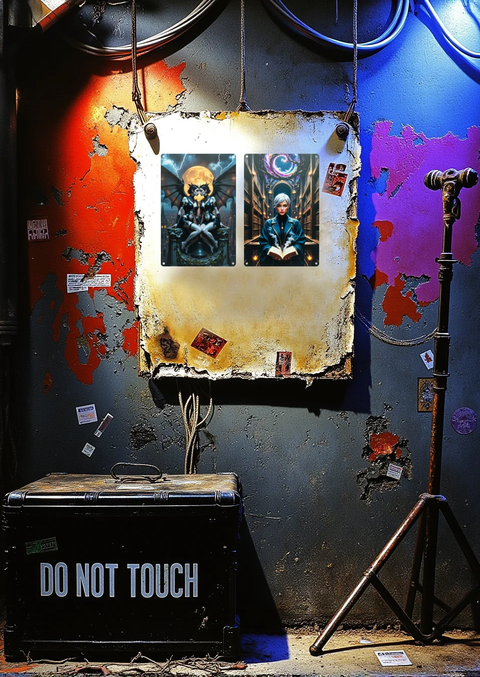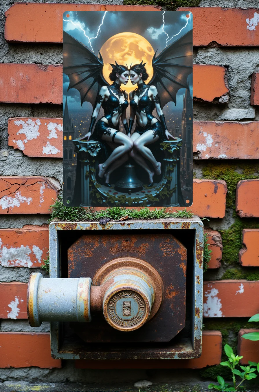 Dunkle Eleganz trifft auf mystische Faszination: Die Gargoyle-Schwestern posieren im Licht des Vollmonds – ein Meisterwerk der Gothic-Ästhetik auf hochwertigem Blech.